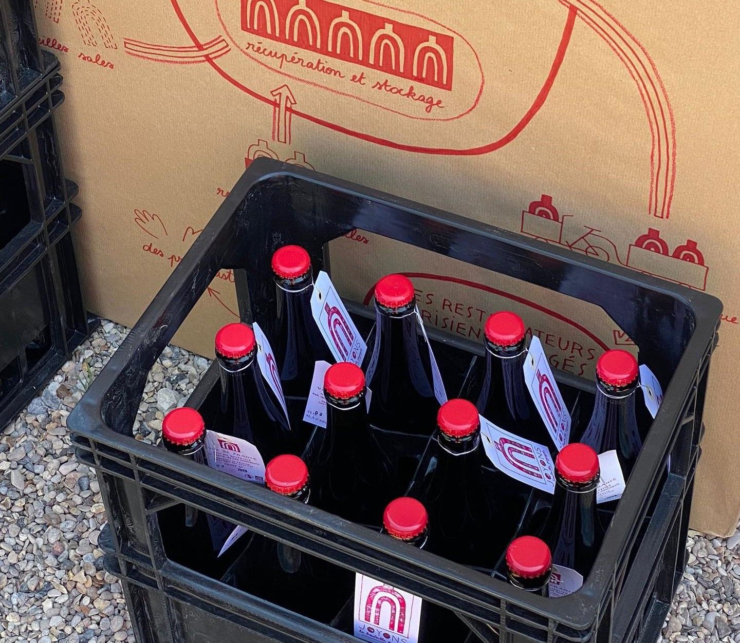 Au sujet du réemploi des bouteilles en verre, l'entreprise Joyons propose un service de consigne de ses bouteilles de vin, réutilisables 80 fois entre des milliers de restaurateurs ! Il suffit de rendre la cagette de bouteilles vides lors de la prochaine livraison. Simple comme bonjour !