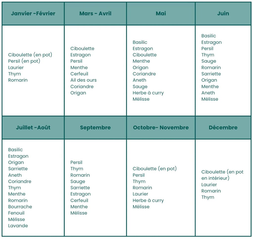 Le mieux reste évidemment de consommer des herbes aromatiques locales et de saison. Donc pour rappel, voici un tableau récapitulatif de la saisonnalité des herbes aromatiques les plus utilisées en France. A noter que ce dernier reste indicatif et peut varier légèrement en fonction des régions et des conditions métérologiques :