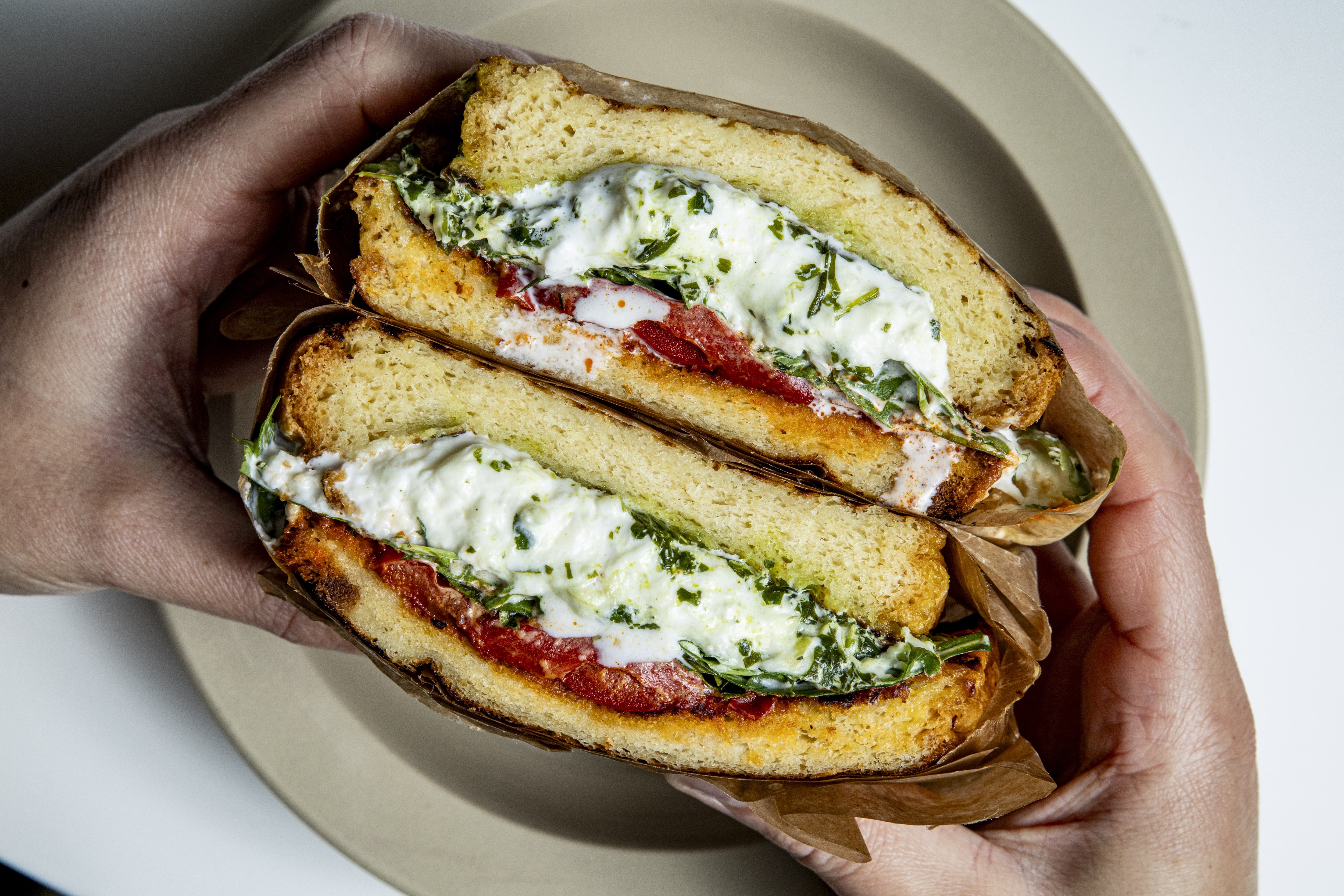 - Sandwichs pains perdus : stracciatella, burrata, salade roquette, tomates confites ;