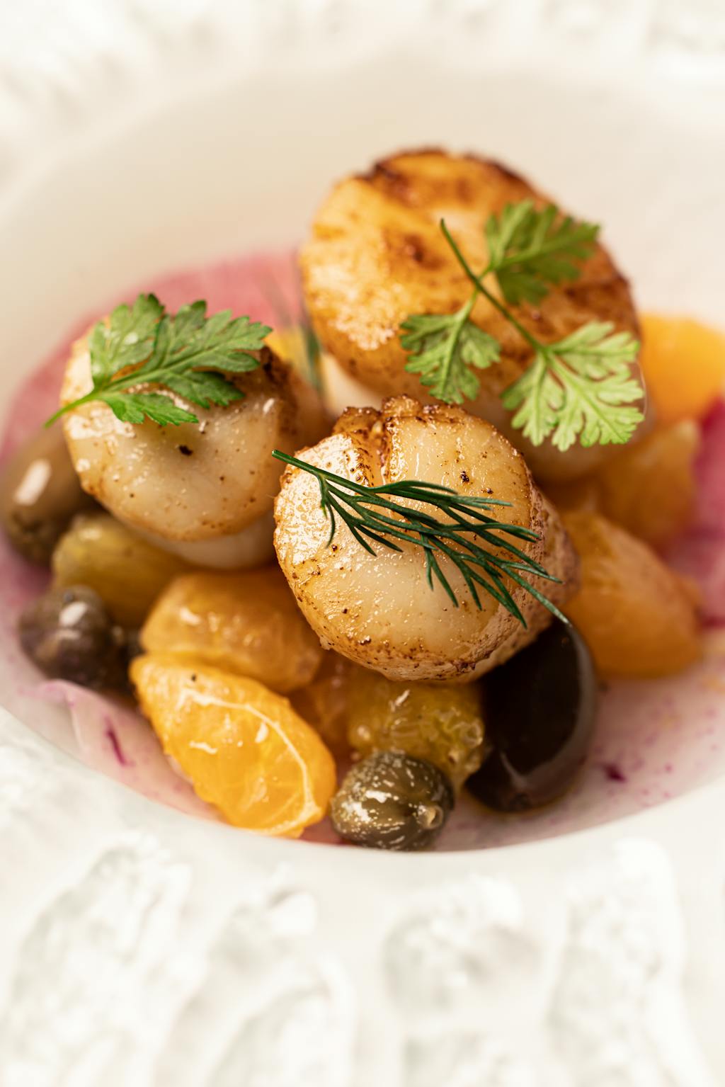 - Carpaccio de noix de Saint-Jacques à la mandarine verte, grenade et caviar d'esturgeon blanc de la maison « Calvisius » ;