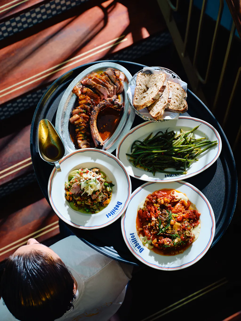 - Poireaux vinaigrette braisés et cuits au charbon de bois, vinaigrette de la maison, croûtons au beurre et noisettes torréfiées ;