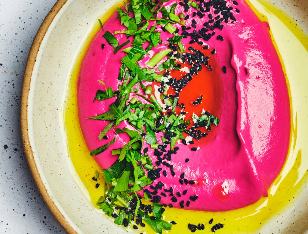 - Salatet Malfouf & Freekeh - Salade de chou rouge, carottes et grenade, blé vert fumé, caviar de pois chiches au tahiné ;