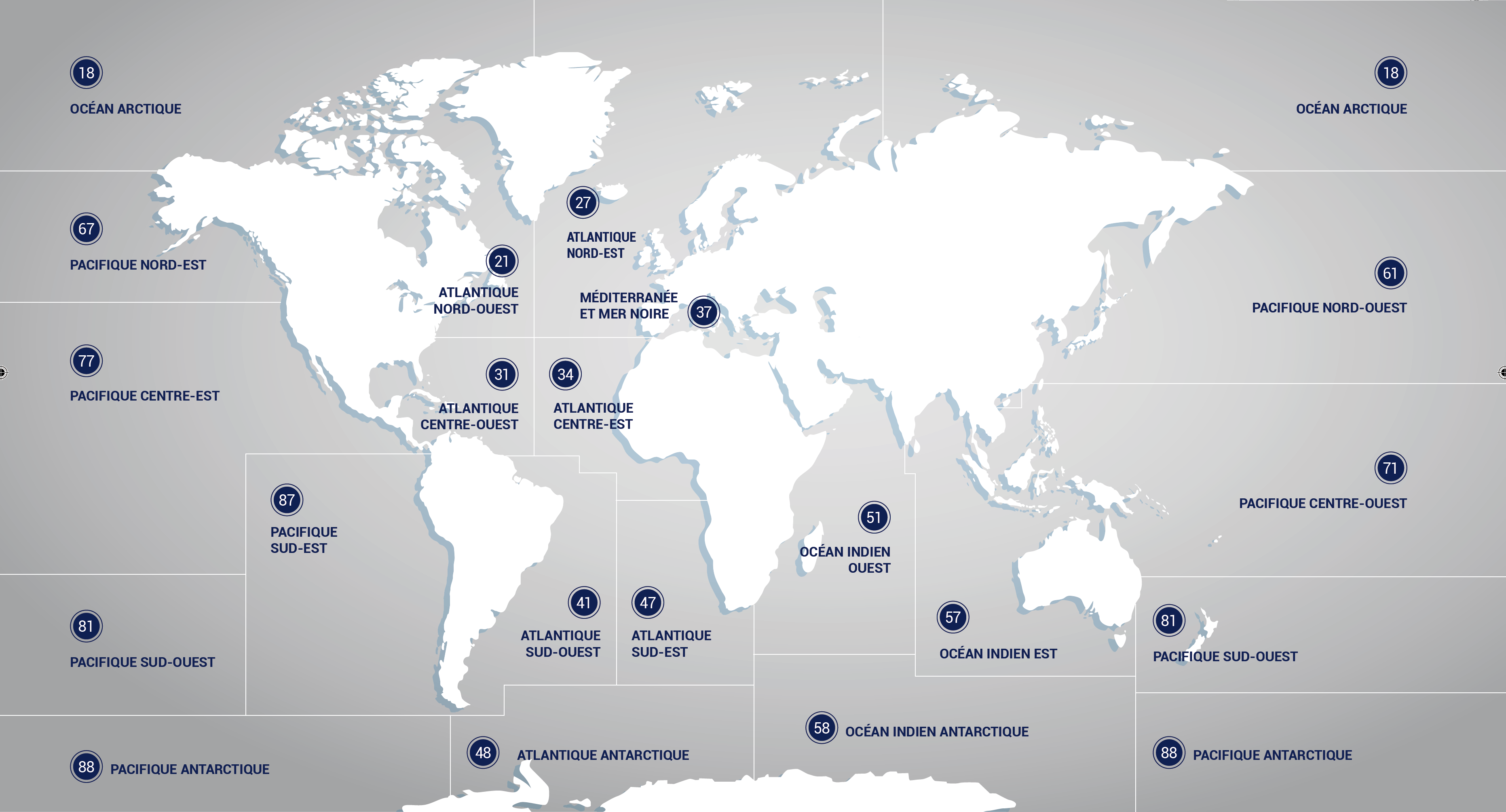 - la zone de capture ou d'élevage, ainsi que la sous-zone de pêche lorsque le produit est pêché dans des eaux proches de la France : en Atlantique du Nord-Est (zone 27), en Méditerranée et Mer Noire (zone 37)