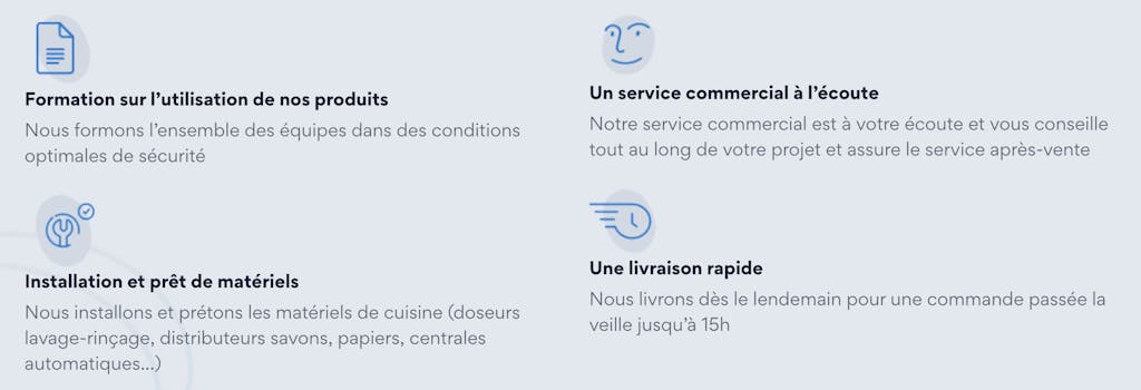 Des plannings d’hygiène, des fiches techniques et de sécurité sont fournis aux clients restaurateurs afin que les bons gestes soient reproduits par les équipes sur le long terme. Des visites sont effectuées régulièrement chez leurs clients afin de suivre la prise en main du matériel, de vérifier le fonctionnement des machines et des produits d’entretien et rappeler les bonnes pratiques d’utilisation.