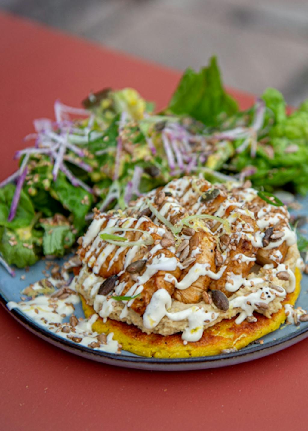 - Galette de pommes de terre maíz, ricotta de noix de cajou, courgettes rôties, romarin et mayonnaise basilic ;